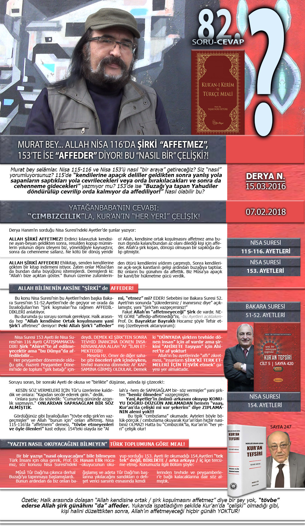 Murat bey selâmlar. Nisa 115-116 ve Nisa 153’ü nasıl “bir araya” getireceğiz? Siz “nasıl” yorumluyorsunuz? 115’de “tapınak apaçık deliller geldikten sonra yanlış yola sapanların saptıkları yola cevrilecekleri veya orda bırakılacakları ve sonra da cehenneme gidecekleri” yazmıyor mu? 153’de ise “Buzağı’ya tapan Yahudiler döndürülüp cevrilip orda kalmıyor da affediliyor!” Nasıl olabilir bu? (Derya N. / 15.03.2016) YATAĞANBABA’NIN (07.02.2018) CEVABI: “CIMBIZCILIK”LA, KUR’AN’IN “HER YERİ” ÇELİŞİK! Derya Hanım’ın sorduğu Nisa Suresi’ndeki Ayetler’de şunlar yazıyor: 116: ALLAH ŞİRKİ AFFETMEZ! Erdirici kılavuzluk kendisine ayan-beyan geldikten sonra, resulden kopup müminlerin yolunun dışını izleyeni biz, yöneldiğiyle kaynaştırır, sonra da cehenneme sallarız. Ne kötü bir dönüş yeridir o! Allah, kendisine ortak koşulmasını affetmez ama bunun dışında kalanı/bundan az olanı dilediği kişi için affeder. Allah’a şirk koşan, dönüşü olmayan bir sapıklığa dalıp gitmiştir. (115-116.Ayetler) 153: ALLAH ŞİRKİ AFFEDER! Ehlikitap, senden kendilerine gökten bir kitap indirmeni istiyor. Zaten onlar Mûsa’dan da bundan daha büyüğünü istemişlerdi. Demişlerdi ki: “Allah’ı bize açıktan göster.” Bunun üzerine zulümlerinden ötürü kendilerini yıldırım çarpmıştı. Sonra kendilerine açık-seçik kanıtların gelişi ardından buzağıya taptılar. Biz onların bu günahını da affettik. Biz Mûsa’ya apaçık bir kanıt/bir hükmetme gücü verdik. (153.Ayet) ALLAH BİLİNENİN AKSİNE “ŞİRKİ” de AFFEDER! Bu konu Nisa Suresi’nin bu Ayetleri’nden başka, Bakara Suresi’nin 51-52.Ayetleri’nde de geçiyor ve orada da İsrailoğulları’nın “Şirk koşmaları”na rağmen AFFEDİLDİKLERİ anlatılıyor. Bu durumda şu soruyu sormak gerekiyor. Halk arasında hep “Allah kendisine Ortak koşulmasını yani Şirk’i affetmez” deniyor! Peki Allah Şirk’i “affeder” mi, “etmez” mi? EDER! Sebebini ise Bakara Suresi 52.Ayeti’nin sonunda “şükredersiniz / inanırsınız diye” açıklamıştır, yani “Şirk’ten vazgeçersiniz!” Fakat Allah’ın “affetmeyeceği” Şirk de vardır. Konuyu / NEYE GÖRE “affedip-affetmediği”ni, -bu Ayetleri açıklarken- Prof.Dr. Bayraktar Bayraklı Hocamız şöyle Tefsir etmiş (özetleyerek aktarıyorum): Nisa Suresi 153 Ayeti ile Nisa Suresi’nin 116 Ayeti ÇATIŞMAMAKTADIR! Şirk “Ahiret”te af edilmeyecektir ama “bu Dünya”da affedilebilir. Her Peygamber Döneminde olduğu gibi, Hazreti Peygamber Dönemi’nde de Toplum “Şirk Batağı” içindeydi. DEMEK Kİ ŞİRK’TEN SONRA TEVHİD İNANCINA DÖNEN İNSANLARA ALLAH AF İLAN ETMEKTEDİR! Mesela Hz.Ömer de Diğer Sahabe gibi önceleri Şirk içindeyken, “Tevhid İnancı’na dönmek”le AF KAPSAMINA GİRMİŞ OLDULAR. Demek ki “Dünya’da Şirk’ten Tevhi’de dönen insan” için af vardır ama Şirki’ni “Ahirete Taşıyan” için Ahiret’te af yoktur! Allah’ın bu Ayetleri’nde “Af”fı zikretmesi, “insanların ŞİRK’Kİ TERK ETMELERİ İÇİN TEŞVİK etmek” gayesi yer almaktadır (“Yeni Bir Anlayışın Işığında Kur’an Tefsiri” Kitabı / Clit 5 / Sayfa 420) Soruyu soran, bir sonraki Ayeti de okusa ve “birlikte” düşünse, aslında işi çözecek!: KESİN SÖZ VERMELERİ İÇİN Tûr’u üzerlerine kaldırdık ve onlara: “Kapıdan secde ederek girin.” dedik. Onlara şunu da söyledik: “Cumartesi gününde azgınlık yapmayın.” ONLARDAN SAPASAĞLAM BİR SÖZ ALMIŞTIK. (Nisa Suresi / 154.Ayeti) Gördüğünüz gibi İsrailoğulları “tövbe edip Şirk’ten vazgeçmişler” ve Allah “bunun için” onları affetmiş. Nisa 115-116’da “affetmem” demesi, “tövbe etmeyenleri ve öyle ölenleri” kast ediyor. 154’teki olayda ise “Allah’a –hem de SAPASAĞLAM bir- söz vermişler” yani Şirk’ten “henüz ölmeden” vazgeçmişler. Yani Ayetler’in önünü-arkasını okuyup KONUYU DOĞRU-DÜZGÜN ANLAMADAN hemen “vaaaş, Kur’an’da çelişki mi var şekerim” diye ZIPLAMANIN alemi yok!!! Bu tipik “cımbızlama” okumadır. Ayteleri böyle bölük-pörçük / cımbızlama okuyarak Kur’an’dan hiçbir nasibiniz OLMAZ! Hatta bu “Cımbızcılık”la, Kur’an’ın “her yeri” çelişik olur! Bir Yazı’yı “nasıl okuyacağını” bile bilmeyen Türk İnsanı için olsa gerek, Prof.Dr. Hasan Elik Hocamız, söz konusu Nisa Suresi’ndeki –Okuyucu’nun okuyup-sorduğu 153.Ayeti ile okumadığı 154.Ayetleri “tek tek” değil, BİRLİKTE / arka arkaya / iç içe Tercüme etmiş. Konumuzla ilgili Bölüm şöyle: Mûsâ Tûr Dağı’na çıkınca derhal Buzağı’ya tapınmaya başlamışlardı. Bunun ardından da biz onları bağışlamış ve adeta Tûr Dağı’nın başlarına yıkılacağını sandıkları o dehşet verici sarsıntı esnasında kendilerinden Tevhid’e ve Peygamberler’e bağlı kalacaklarına dair söz almıştık. (“Tevhit Mesajı – Özlü Kur’an Tefsiri” Kitabı / Sayfa: 247)