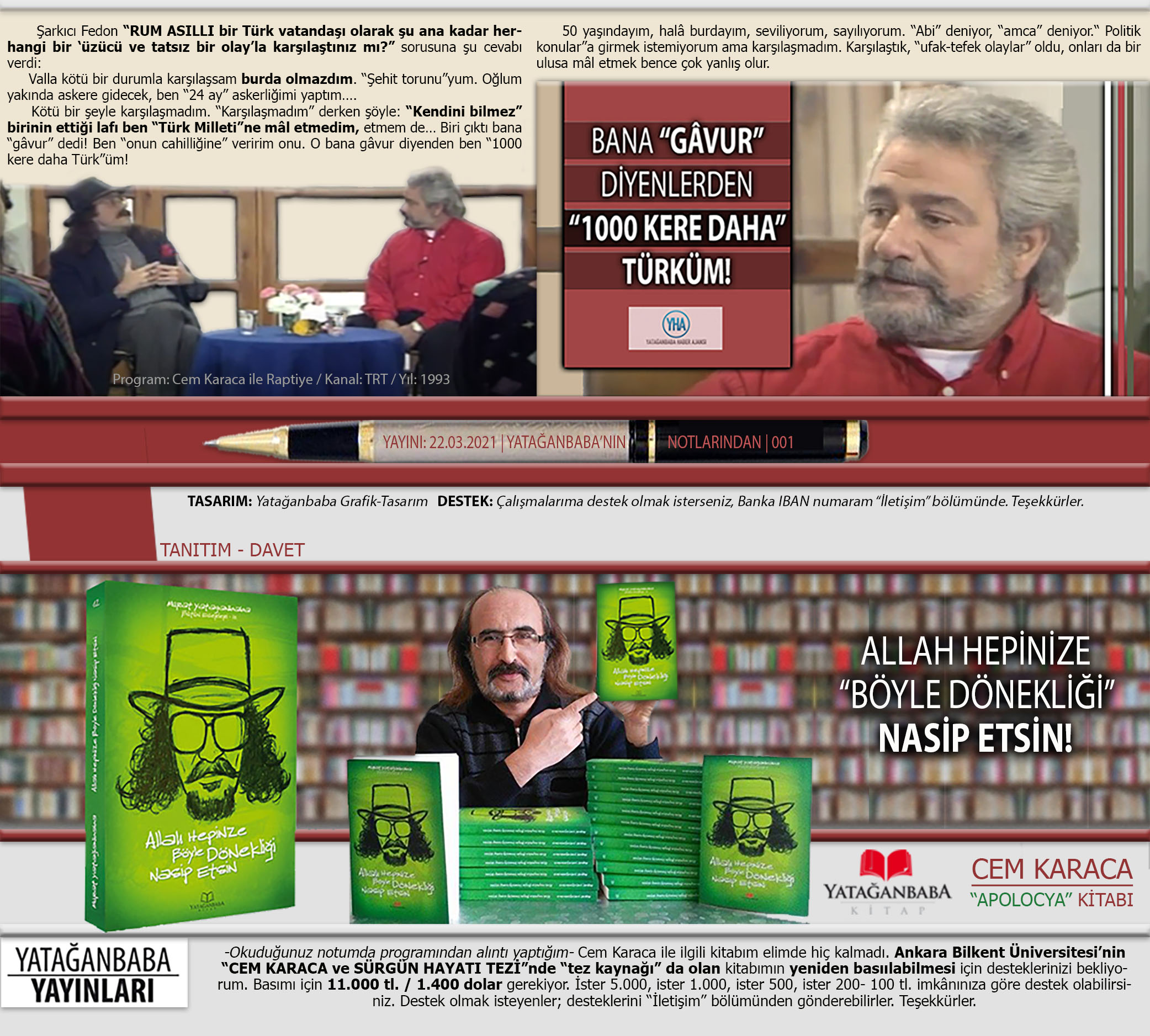 Şarkıcı Fedon “RUM ASILLI bir Türk vatandaşı olarak şu ana kadar herhangi bir ‘üzücü ve tatsız bir olay’la karşılaştınız mı?” sorusuna şu cevabı verdi: Valla kötü bir durumla karşılaşsam burda olmazdım. “Şehit torunu”yum. Oğlum yakında askere gidecek, ben “24 ay” askerliğimi yaptım…. Kötü bir şeyle karşılaşmadım. “Karşılaşmadım” derken şöyle: “Kendini bilmez” birinin ettiği lafı ben “Türk Milleti”ne mâl etmedim, etmem de… Biri çıktı bana “gâvur” dedi! Ben “onun cahilliğine” veririm onu. O bana gâvur diyenden ben “1000 kere daha Türk”üm! 50 yaşındayım, halâ burdayım, seviliyorum, sayılıyorum. “Abi” deniyor, “amca” deniyor.“ Politik konular”a girmek istemiyorum ama karşılaşmadım. Karşılaştık, “ufak-tefek olaylar” oldu, onları da bir ulusa mâl etmek bence çok yanlış olur. Program: Cem Karaca ile Raptiye / Kanal: TRT / Yıl: 1993