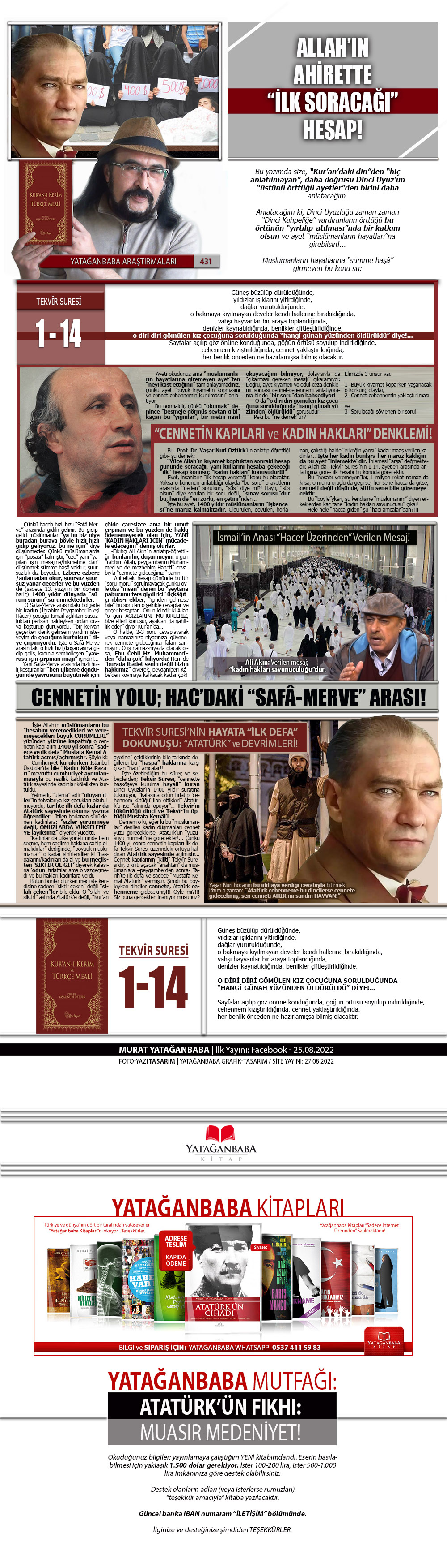 İşte özetlediğim bu süreç ve sebeplerden; Tekvîr Suresi “cennette başköşeye kurulma hayali” kuran Dinci Uyuzlar’ın 1400 yıldır suratına tükürüyor, “kafasına odun fırlatıp ‘cehennem kütüğü’ ilan ettikleri” Atatürk’ü ise “alnında öpüyor”…