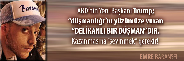 Trump’a “üzülmeyin” arkadaşlar, aksine “sevinin”… Zira bize “Dostunuzuz” deyip, kapılar ardında gizli gizli “Teröristler’e yardım” yapanlar değil, açıkça Trump gibi “Düşmanlıkları’nı yüzümüze vuranlar” lazım. Açık Düşman “Gizli Düşman”dan evladır. Trump “Delikanlı bir Düşman”dır. Kendisini “tebrik” ederim. (Emre Baransel / Facebook Notu / 09.11.2016)