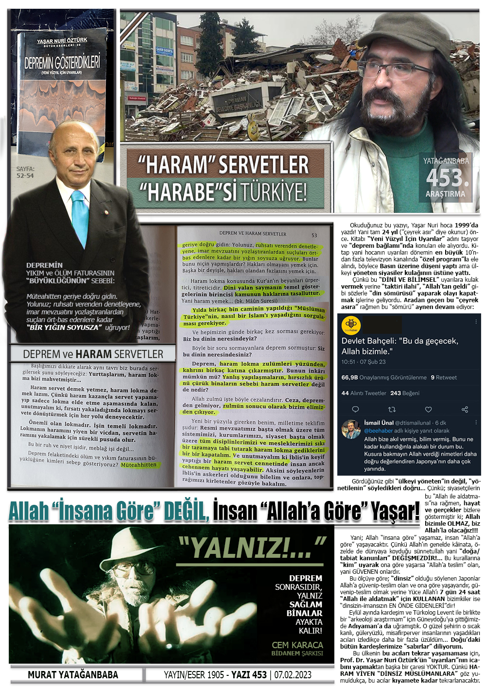 Bu ülkenin bu acıları tekrar yaşamaması için, Prof. Dr. Yaşar Nuri Öztürk’ün “uyarıları”nın icabını yapmaktan başka bir çaresi yoktur ve olmayacaktır. Çünkü Haram yiyen “DİNSİZ MÜSLÜMANLARA” göz yumuldukça, bu acılar kıyamete kadar tekrarlanacaktır!