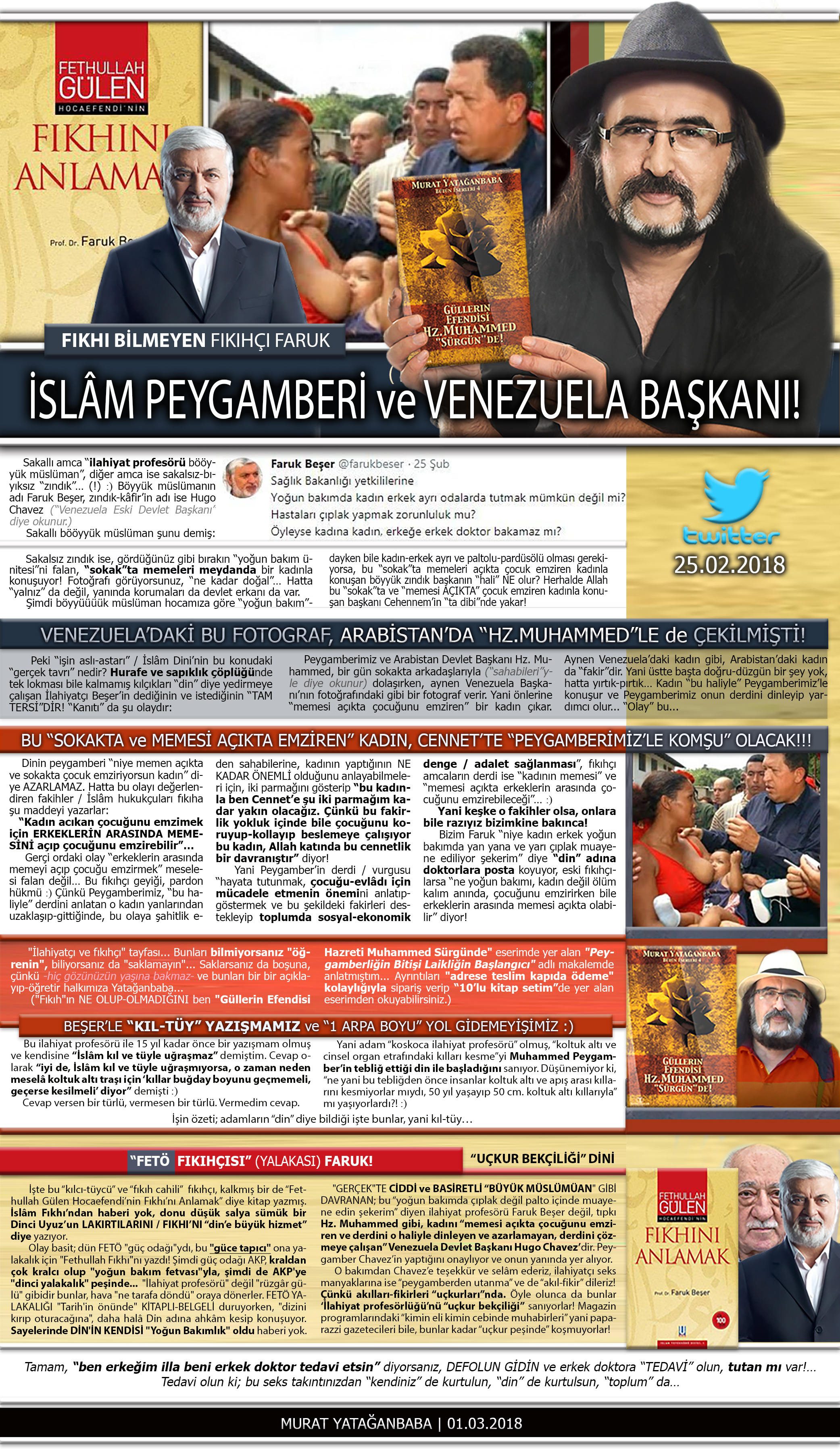 “Büyük Müslüman” gibi davranan, bu “Yoğun Bakım’da çıplak değil Palto içinde muayene edin şekerim” diyen İlahiyat Profesörü Faruk Beşer değil, tıpkı Hz.Muhammed gibi, kadını “memesi açıkta çocuğunu emziren ve derdini o haliyle dinleyen ve azarlamayan, derdini çözmeye çalışan” Venezuela Devlet Başkanı Hugo Chavez’dir. Peygamber Chavez’in yaptığını onaylıyor ve onun yanında yer alıyor. O bakımdan Chavez’e teşekkür ve selâm ederiz, İlahiyatçı Seks Manyakları’na ise “Peygamber’den utanma” ve de “akıl-fikir” dileriz!