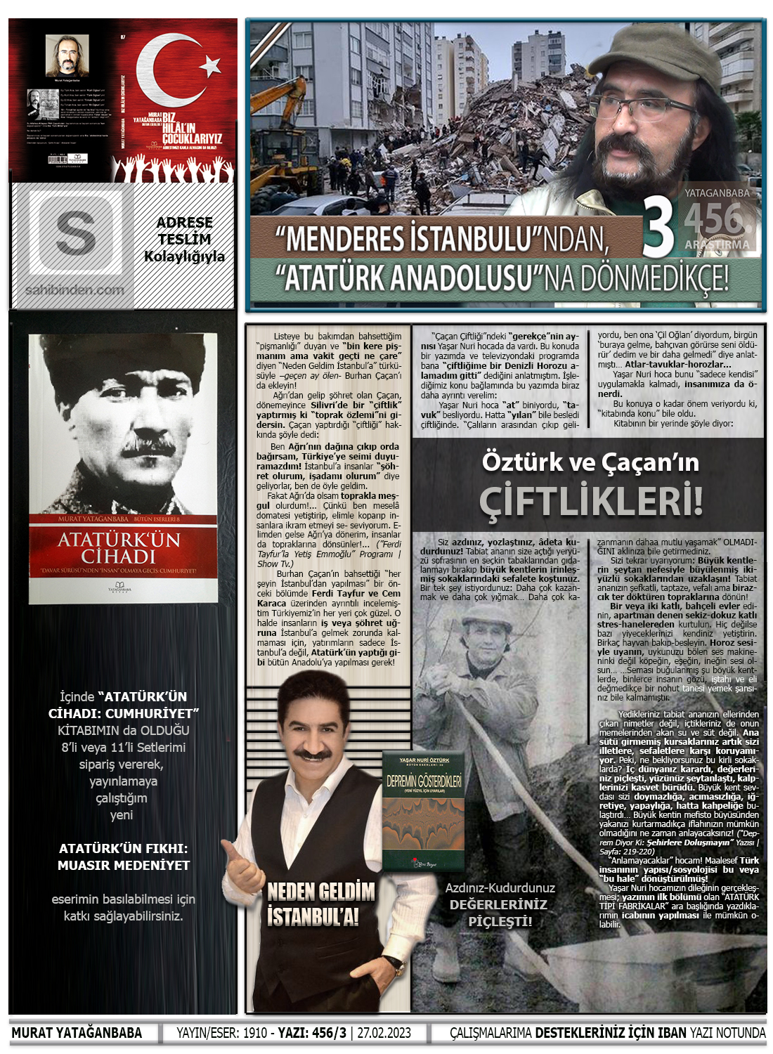 Yedikleriniz tabiat ananızın ellerinden çıkan nimetler değil, içtikleriniz de onun memelerinden akan su ve süt değil. Ana sütü girmemiş kursaklarınız artık sizi illetlere, sefaletlere karşı koruyamıyor. Peki, ne bekliyorsunuz bu kirli sokaklarda? İç dünyanız karardı, değerleriniz piçleşti, yüzünüz şeytanlaştı, kalplerinizi kasvet bürüdü. Büyük kent sevdası sizi doymazlığa, acımasızlığa, iğretiye, yapaylığa, hatta kahpeliğe bulaştırdı… Büyük kentin mefisto büyüsünden yakanızı kurtarmadıkça iflahınızın mümkün olmadığını ne zaman anlayacaksınız!… (“Deprem Diyor Ki: Şehirlere Doluşmayın” Yazısı | “Depremin Gösterdileri / Yeni Yüzyıl İçin Uyarılar” | Kitabı | Baskı: 5 – Sayfa: 219-220)