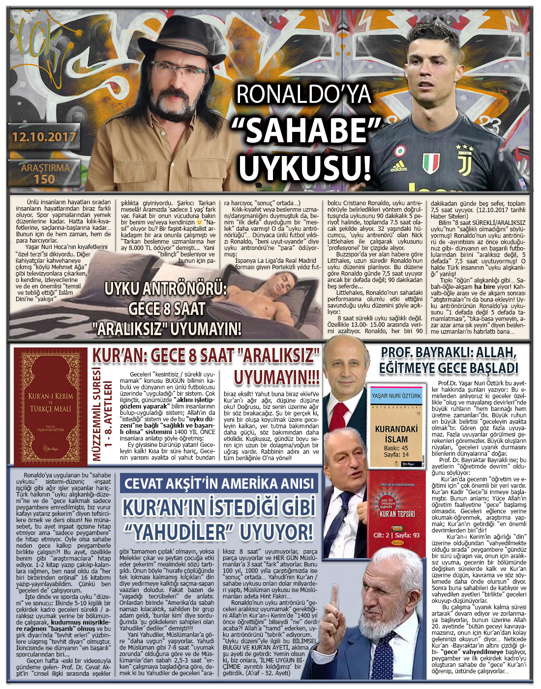 Ronaldo’ya uygulanan bu “sahabe uykusu” sistemi-düzeni; -inşaat işçiliği gibi ağır işler yapanlar hariç- Türk halkının “uyku alışkanlığı-düzeni”ne ve de “gece kalkmak sadece peygambere emredilmiştir, biz vurur kafayı yatarız şekerim” diyen tefsircilere örnek ve ders olsun! Ne münasebet, bu ayet inşaat işçisine hitap etmiyor ama “sadece peygambere” de hitap etmiyor. Öyle olsa sahabe neden gece kalkıp peygamberle birlikte çalışsın?! Bu ayet, özellikle benim gibi “araştırmacılara” hitap ediyor. 1-2 kitap yazıp çakılıp-kalanlara rağmen, ben nasıl oldu da “her biri birbirinden orijinal” 16 kitabımı yazıp-yayınlayabildim. Çünkü ben “geceleri de” çalışıyorum.